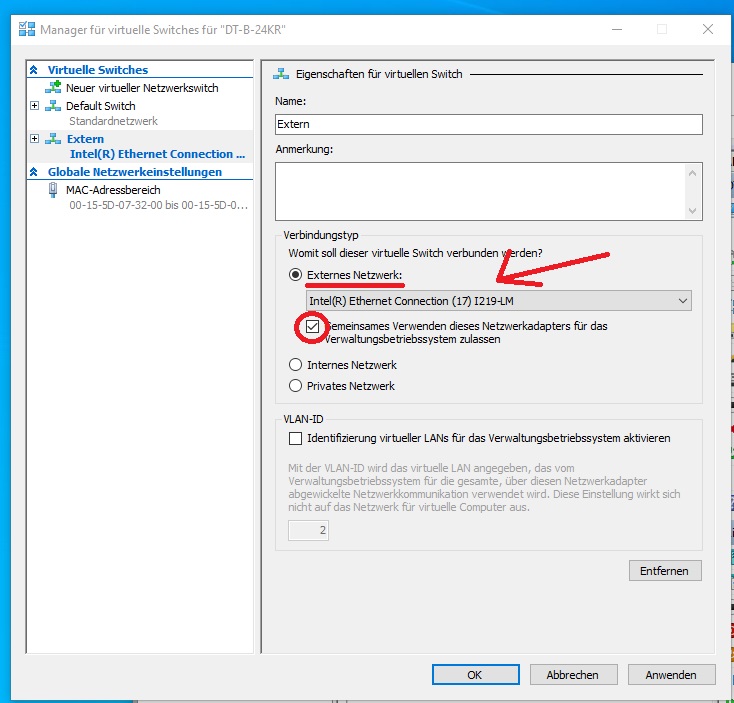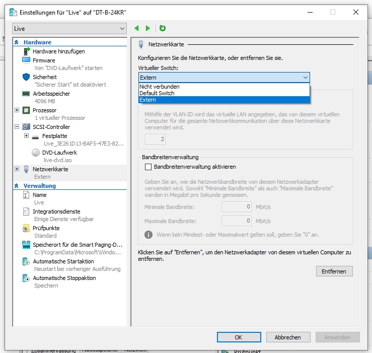 → Dynamischen Speicher aus, mindestens 2048 MB Arbeitsspeicher